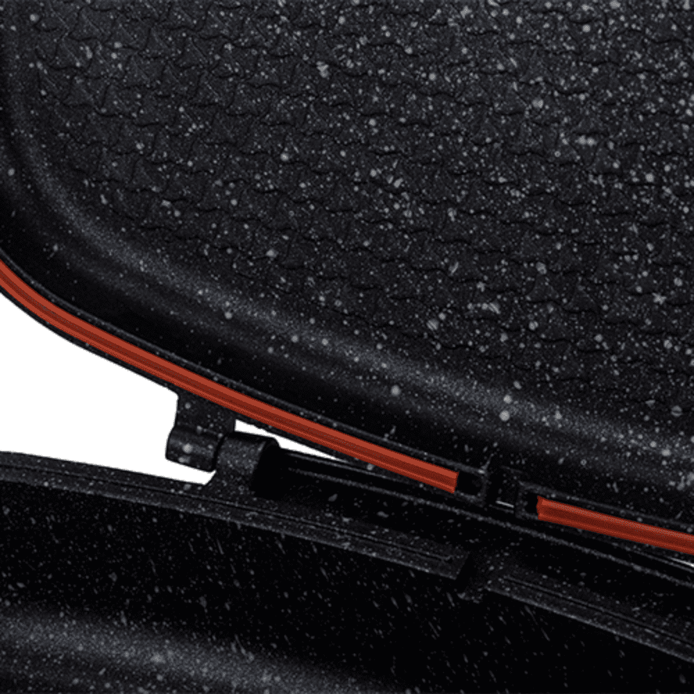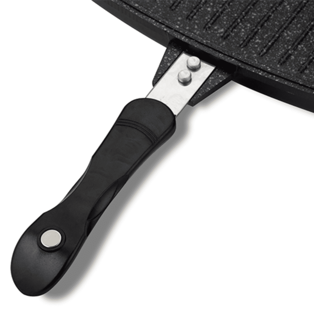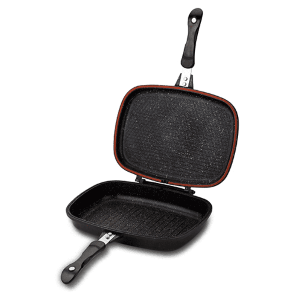 جريل مزدوج عالي الجودة مصنوع من الألومنيوم المصبوب ومطلي بخمس طبقات من الجرانيت غير اللاصق لضمان متانة وأداء ممتاز. تصميم عملي يساعدك على الطهي بسهولة وراحة، مع حلقة سيليكون معتمدة من FDA تمنع تسرب الروائح والدخان وطرطشة الزيت وتحافظ على العصارة داخل الطعام ليخرج طري وشهي.