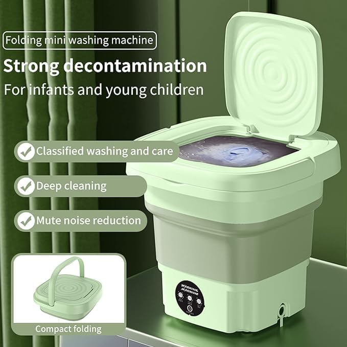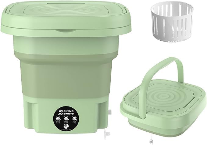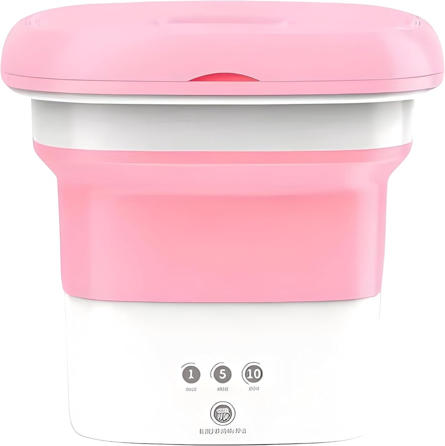 غسالة صغيرة قابلة للطي عملية وسهلة الاستخدام لغسيل الملابس بسرعة وبدون مجهود. مثالية لغسيل الطرح، الشرابات، ملابس البيبي والملابس الداخلية. حجمها الصغير يسمح بتخزينها بسهولة في أي مكان بعمق 9 لتر، ومزودة بأسطوانة تنشيف ومخرج تصريف لتسريع عملية الغسيل والتنشيف.